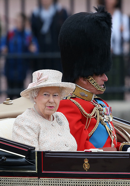 | Queen Elizabeth II and Prince Philip, Duke of Edinburgh travel in the royal carriage during the Trooping Tthe Colour on June 13, 2015 in London, England. |