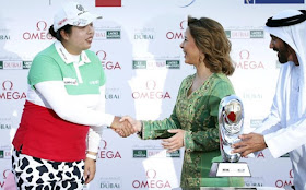 | Shanshan Feng (L) of China is presented with a trophy by Princess Haya Bint Al-Hussein (R), the wife of Sheikh Mohammed Bin Rashid Al-Maktoum, Vice-President and Prime Minister of the UAE and Ruler of Dubai, after winning the Dubai Ladies Masters golf tournament on December 12, 2015 in the Gulf emirate. |