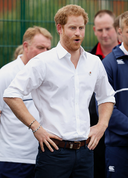 | Prince Harry, bracelet detail, attends an RFU-backed community rugby programme in Alexandra Park on June 21, 2016 in Stockport, England. |