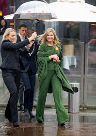 Not one drop of rain bother Queen Maxima as she showcased her usual enthusiasm as she arrives for an International Women's Day event in Amsterdam.