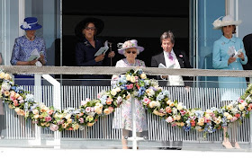 | Queen Elizabeth II looks on in a flowery dress from a balcony at the Epsom races on Derby day. |