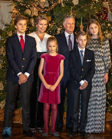 | After posing by the ornate Christmas tree and life-size nativity scene the Belgian Royal family joined other guests in the Palace ballroom for the concert on December 19, 2018 |