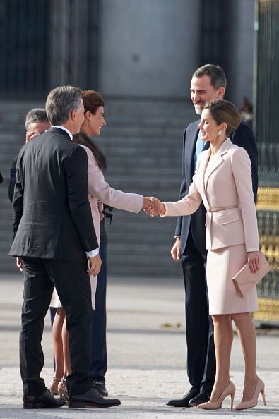| Queen Letizia of Spain receives Argentinian President Mauricio Macri and his wife Juliana Awada at the Royal Palace on February 22, 2017 in Madrid, Spain. |